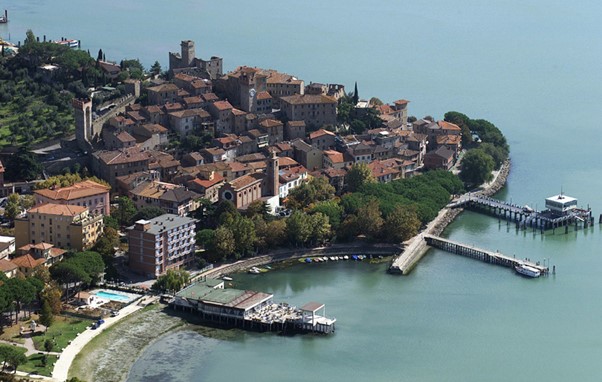 Castiglione del Largo, a small town located on the south-west shoreline on beautiful Lake Trasimeno, has been disputed territory over the past 2,000 years due to its location. The town originally covered a small island but over centuries as the town grew after the 13th-Century, it was joined to the mainland with the construction of churches, piazzas, houses, and other buildings. The well-preserved historical centre contains the Palazzo della Corgna, which now houses a civic museum and gallery with late Renaissance frescos and paintings. The palazzo is connected by a long, covered tunnel to the Fortress of the Lion, a pear-shaped castle featuring square towers in each of its four corners and a triangular shaped bastion. The castle completed in 1247, was intended to give Emperor Frederick 11 strategic control over Lake Trasimeno and withstood many sieges over the following centuries.