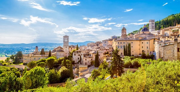 Assisi, the birthplace of St Francis in 1182, is a breathtaking and astounding sight greeting all visitors as they approach this beautiful walled town built in pink and white stone located in an impressive setting in the Valle Umbria on the slopes of Mount Subasio. The magnificence of the 13th-Century Basilica of San Francesco rising from the mountainside is an incredibly imposing spectacle. The Basilica contrasts dramatically with the narrow and quaint streets with Roman ruins and sacred shrines winding through the city now offering restaurants in unusual locations and numerous shops offering art, linens, religious artifacts, and souvenirs of Assisi.